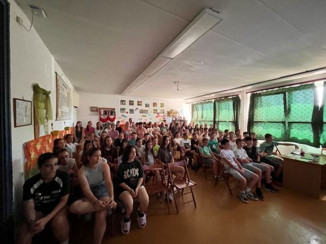 A séta után a Református Egyházközség Alapiskoláját is meglátogattuk, ahol egy barátságos focimeccs várt ránk. Ezt a programot már nagyon vártuk. Egy nagypályás és egy kispályás focimeccs is zajlott szinkronban. A többiek lelkesen szurkoltak nekünk.