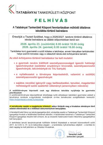 2025. 12. 04. A 2026/2027. tanévre történő általános iskolai beiskolázás Beiratkozás Beiskolázási információk a 2026/2027. tanévre